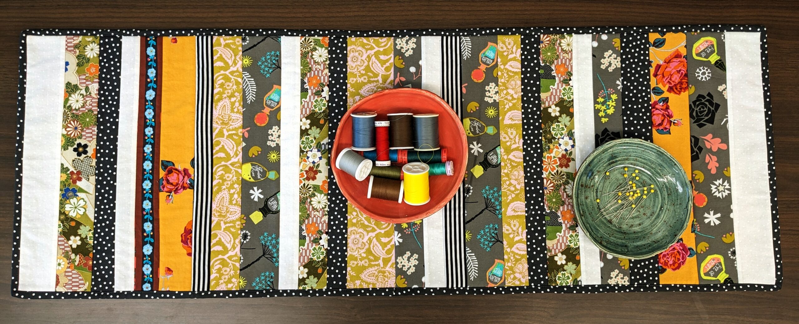 Using a variety of cotton fabrics and scraps, you will learn how to make a table runner for any size table.  You will also learn how to rotary cut different size strips, sew ¼” seams, pressing techniques, and make and sew quilt binding with mitered corners. The class sample table runner is 14” x 40”; however, you can make it the length you choose.